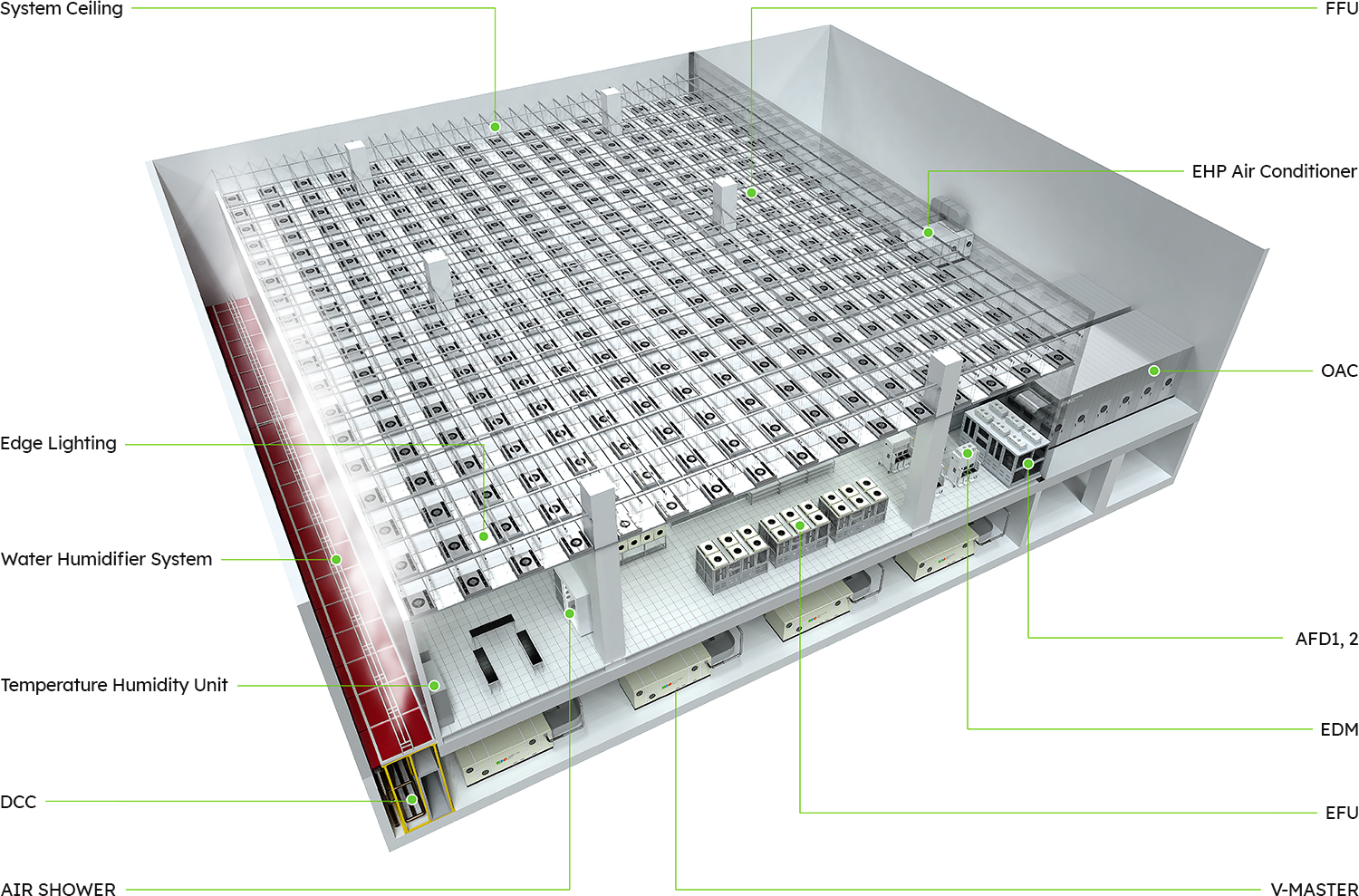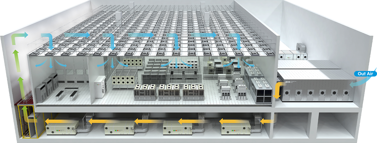 Based on the high level of trust through innovative air control technology, we are providing our customers with the best solutions for the safety of the production environment, yield improvement, and energy saving, and we are doing our best to build a customized environment for customers by establishing the temperature and humidity environment required in a clean room and continuously developing core technologies to control contaminants including AMC