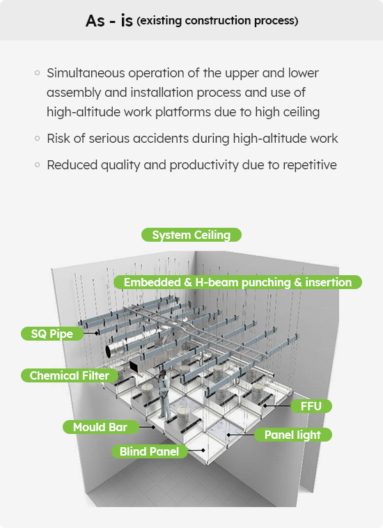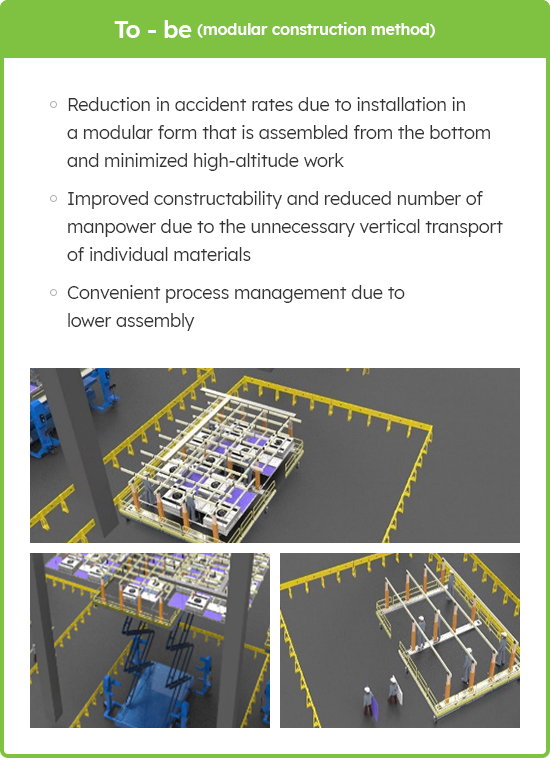 No risk of safety accidents due to reduced high-altitude work and shortened construction period through the development of modularized system ceiling equipment and its construction methods with enhanced safety