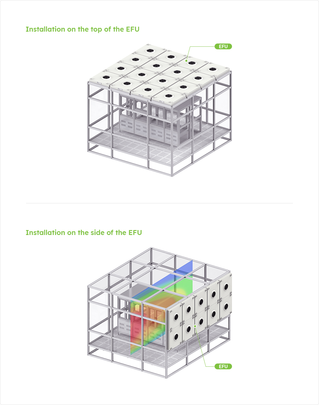 An air cleaning system that is installed in the production facilities and mini environment in the clean room to supply clean air, maintain differential pressure, and control airflow and to remove more than 99.9999% of 0.1μm particles in size
