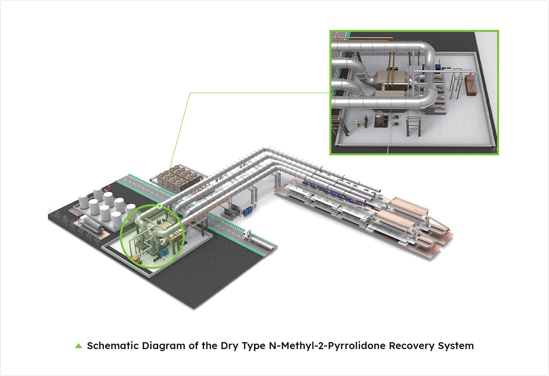 | Processed air | Installation of large/many absorption towers Increasing the volume of NMP storage tanks | Recycling of waste heat in the production line Reducing atmospheric emissions and saving energy consumption for air-conditioning through exhaust recirculation |
