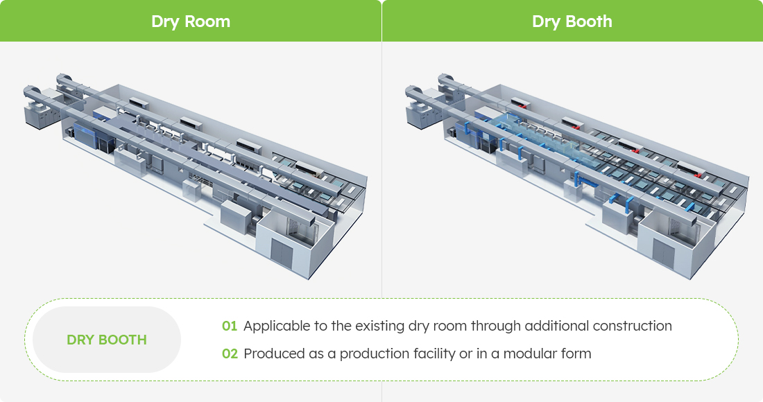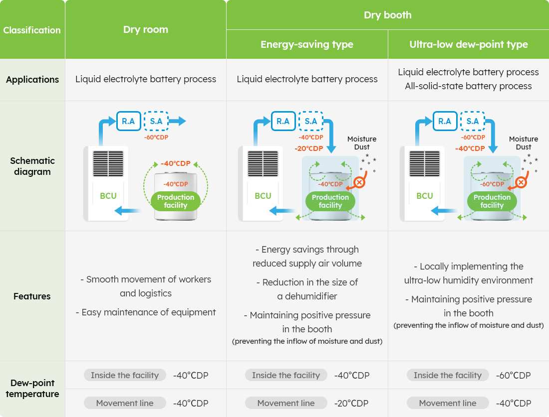 Shinsung E&G provides our customers with a dry room that has an ultra-low humidity environment (-60℃DP) to produce secondary batteries. We have begun developing dry room technology that reduces the operating energy of industrial dehumidifiers through a technical partnership with a company specializing in desicant rotors in 2016. As a result, we have obtained a patent for a dry booth that reduces controlling costs by reducing the amount of air at a low dew point, supplied to the local dehumidification area in the dry room. We are building an optimal environment by controlling humidity perfectly with innovative air control technology, and we are achieving energy efficiency and reduced operating costs through a dry booth. We are continuously conducting technology development to establish an ultra-low humidity environment essential for the production of all-solid-state batteries, and we are actively responding to the increasing global demand for dry rooms by establishing overseas corporations.