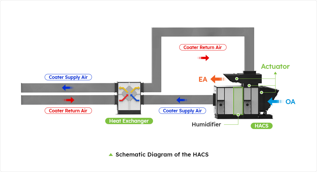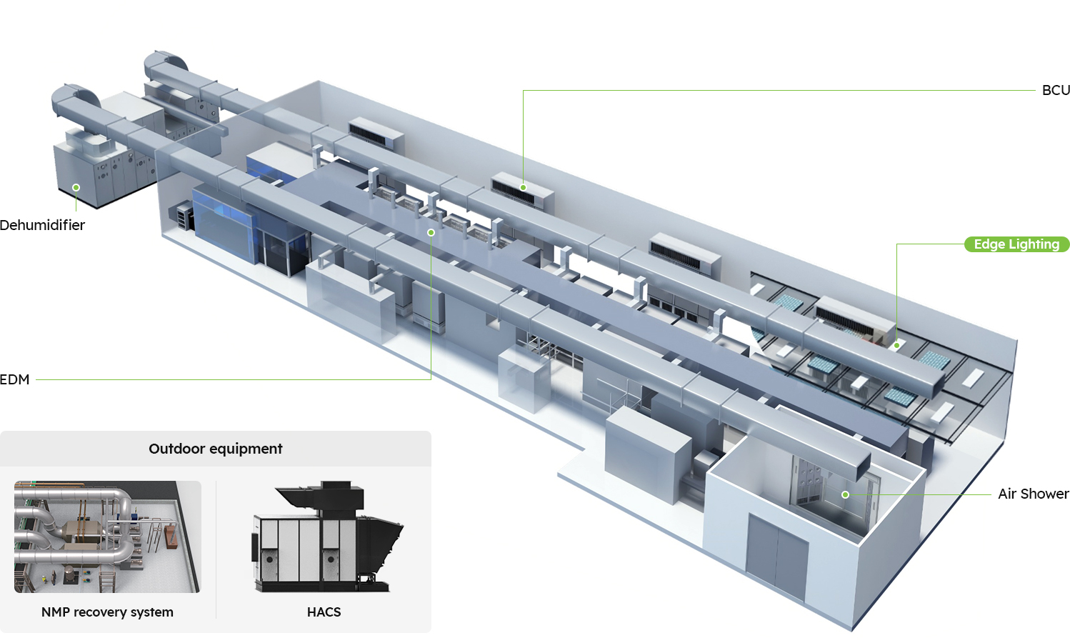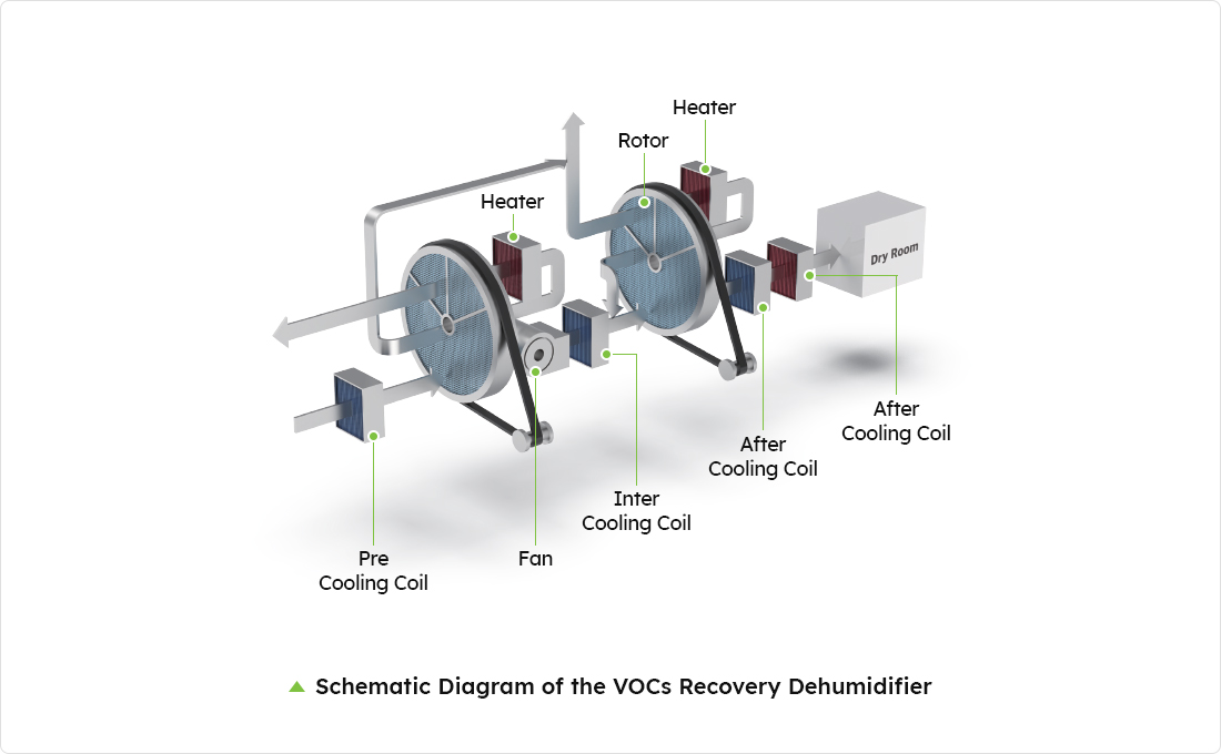 Equipment that maximizes energy savings by removing and reusing VOCs in the dehumidified air used in the dry room and handles VOCs-based chemicals generated during electrolyte injection, membrane process, and coating solution manufacturing process